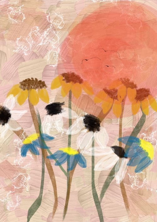 2. A tutaj kwiatki przy zachodzie słońca. A w tle ptaki wracające z ciepłych krajów.