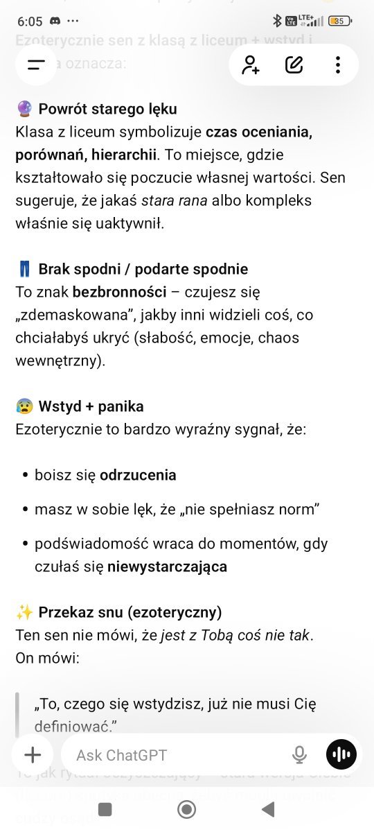 Śnił mi się @Chongyun coś tam że powiedziałam Ci, że jesteś super i że się bardzo zmieniłeś. Więcej niestety nie pamiętam. Drugi sen... Spotkanie ze szkołą z liceum. Jacyś hakerzy z jakiegoś tak ego forum zrobili sobie ,"pośmiewisko" ze mnie. A klasa wszystko widziala. I widzieli ten profil mój tu i tam. Na tym forum i byli ze mnie dumnie czy coś. Wszędzie były kamery. Spotkanie odbywało się jakby w szkole jakiejś innej. Nie wiem. Ciągle coś guubilam Zachowywałam się jak pijana bądź naćpana i znowu byłam bez spodni. Na koniec ktoś mi ogarnął jakieś xd lol. Drugi sen że jestem bez spodni. Aż sobie chyba poszukam znaczenie snu z tym motywem xD