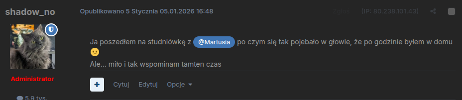 Nie byłem na swojej studniówce. Razem z paroma kolegami uznaliśmy, że to nie dla nas. Całe szczęście, bo ja nikogo bym nie znalazł jeśli chodzi o partnerkę. A i oni mieliby kłopot chociaż na pewno mniejszy niż ja, tak myślę. Do tego doszły ze dwie koleżanki, które też nie miały zamiaru iść. Wywołało to pewne oburzenie u niektórych nauczycieli, że niby jak to NIE IŚĆ na studniówkę? Tak nie można! No ale nie żałowałem tego, bo i nie miałem czego tak naprawdę. Nie przepadałem za większością z tych ludzi. Jednak los sprawił, że na studniówkę poszedłem parę lat później z racji tego, iż miałem młodszą od siebie dziewczynę. Mam mieszane uczucia co do tego wydarzenia. Mieliśmy już wtedy problemy w relacji, ale tego wieczoru było jak najbardziej okej. Partnerka poobcierała sobie stopy przez złe buty i nie tańczyliśmy zbyt dużo. A szkoda, bo lubię. Nie wiem już dlaczego, ale piłem mało alko. Nie znałem tam nikogo, więc głównie rozmawiałem z przyjacielem jej koleżanki. Byłem wtedy też bez leków (prega byłaby zbawieniem), więc ogólnie super zabawy nie miałem. Pamiętam, że było mi szkoda jej innej koleżanki, przyszła z kolesiem który cały czas chodził po sali, rozmawiał z innymi, tańczył z dziewczynami... poza nią. Sporadycznie wracał do stolika i może mieli ze 3 tańce łącznie. Trochę żałuję, że jej nie poprosiłem, ale ja dupa byłem wtedy i dzisiaj. Poza tym ona miała jakieś mini konflikty z moją dziewczyną, więc wolałem nie podgrzewać atmosfery xd A i z racji tego, że dzieliło nas parę lat to wpłynęło to na muzykę jaka była grana. Chyba tylko jedna piosenka disco-polo, parę starszych hitów, a reszta to same nowoczesne utwory ówczesnych raperów, disco-trapów i innych takich gdzie głównie trzeba było skakać. Nie mam nic do tego, ale czasem byłoby fajnie potańczyć normalnie, na trzy. I tyle. Nie rozumiem wywyższania tej imprezy i przyznawania jej takiego wielkiego znaczenia.